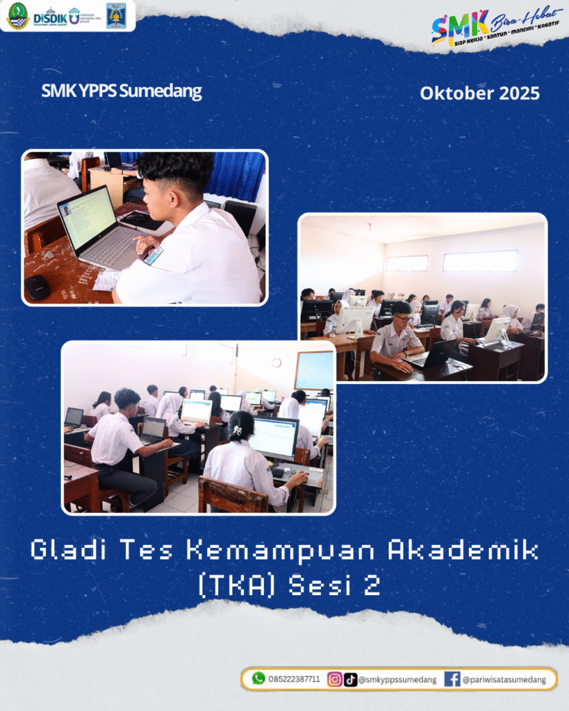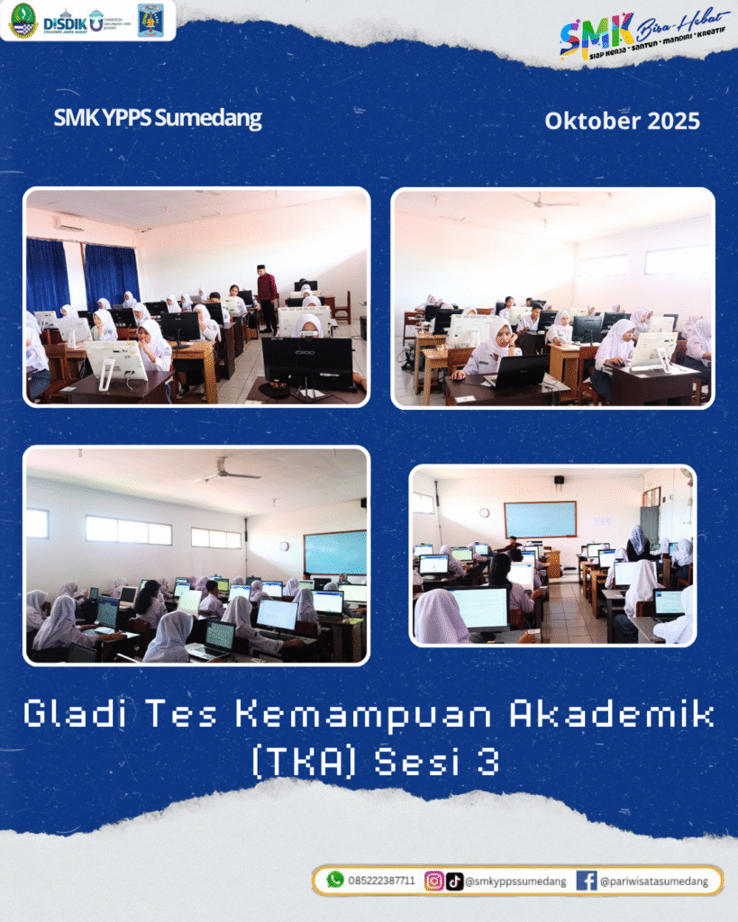 Siswa/Siswi kelas XII SMK YPPS Sumedang melakukan kegiatan Gladi TKA hari pertama pada hari Senin, 27 Oktober 2025. Terdapat 3 sesi. Sesi pertama dimulai Pukul 07.30-10.30, sesi kedua dimulai Pukul 10.45-13.45, sesi ketiga dimulai Pukul 14.00-16.30.