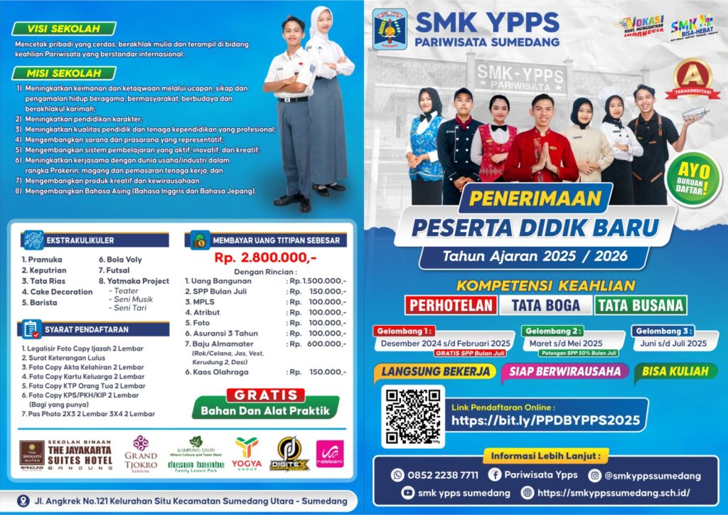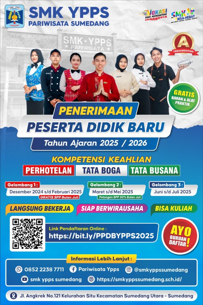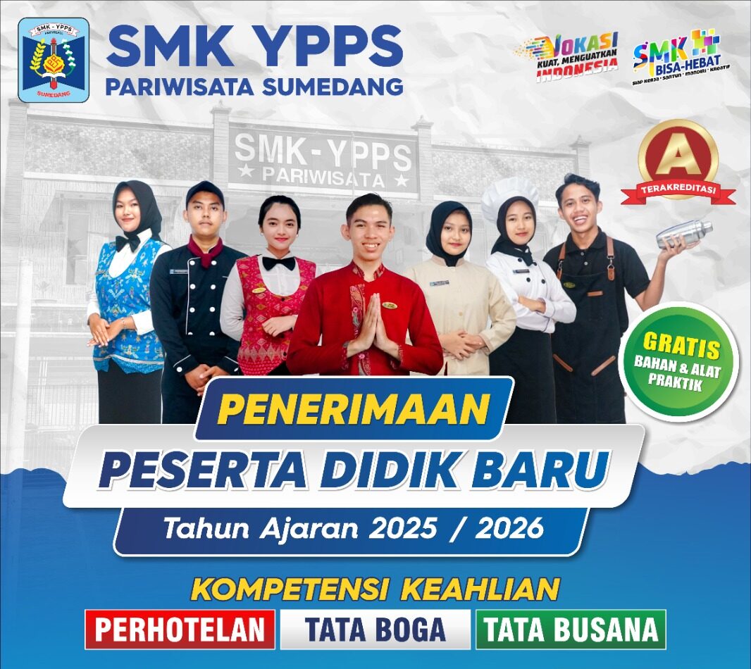 Sebagai salah satu lembaga pendidikan yang ada di Sumedang, SMK YPPS Pariwisata Sumedang sudah Terakreditas “A”. SMK YPPS Sumedang memiliki 3 Jurusan yaitu, Perhotelan, Tata Boga dan Tata Busana. PPDB SMK YPPS Pariwisata Sumedang sudah dibuka. Bergabunglah dengan kami dan nikmati peluang untuk mengeksplorasi minat, bakat dan ambisimu.